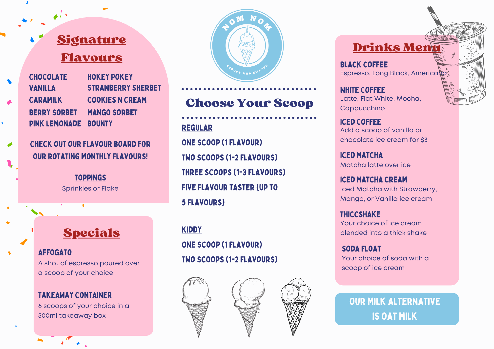 We change it up every month and scoop up seasonal specials! This month we have the following flavours in the cabinet: